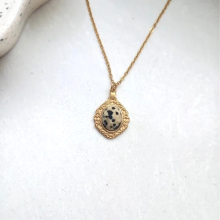 Naszyjnik na łańcuszku ze stali szlachetnej z zawieszką z jaspisem dalmatyńskim.